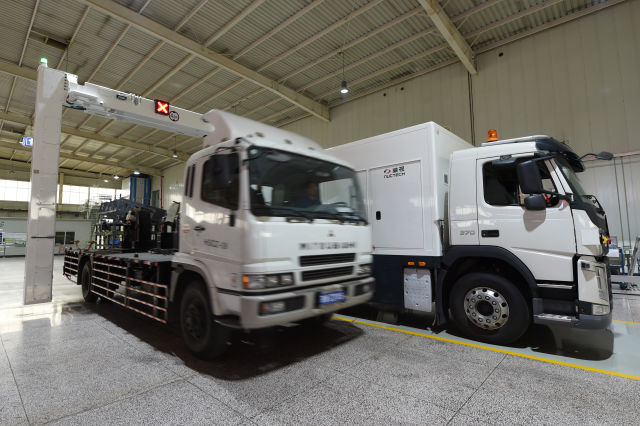 4月20日,同方威視的工作人員在演示車載式集裝箱檢查系統(tǒng),被檢車輛穿“拱門”而過,整臺車的安檢圖像就可以顯示在屏幕上。(新華社記者 鞠煥宗 攝)