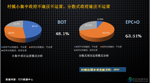 據(jù)E20研究院研究結(jié)果顯示,村鎮(zhèn)小集中采用政府不建設(shè)不運(yùn)營(yíng)的比例最高,即BOT模式,占比達(dá)到48.1%;村鎮(zhèn)分散式采用政府建設(shè)不運(yùn)營(yíng)模式,即EPC+O,占比達(dá)63.51%。“未來(lái)在政策的推動(dòng)下,PPP模式是村鎮(zhèn)治理的發(fā)展方向。”